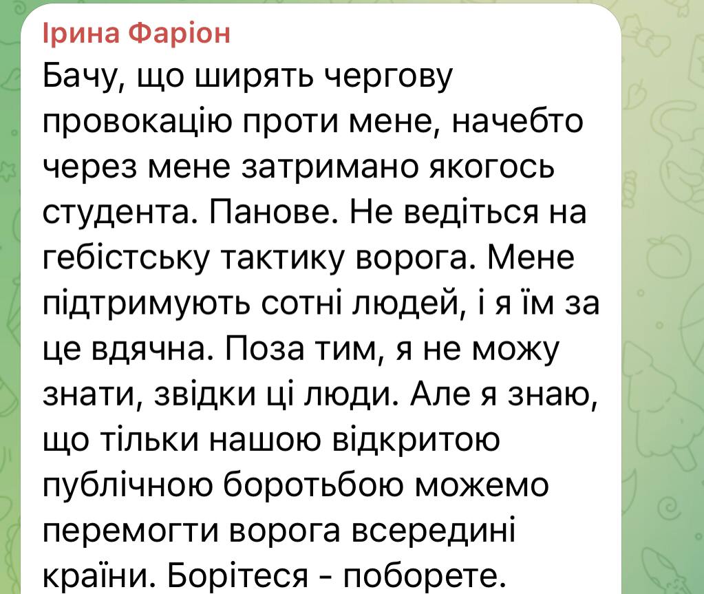 Однак це не спинило Фаріон в умовах воєнного стану розголосити персональні дані хлопця. А це може мати й вже має (!) наслідки. Це не тільки втручання у приватне життя особи, але і спричинена загроза особистої безпеки та життя студента", - йдеться в дописі.