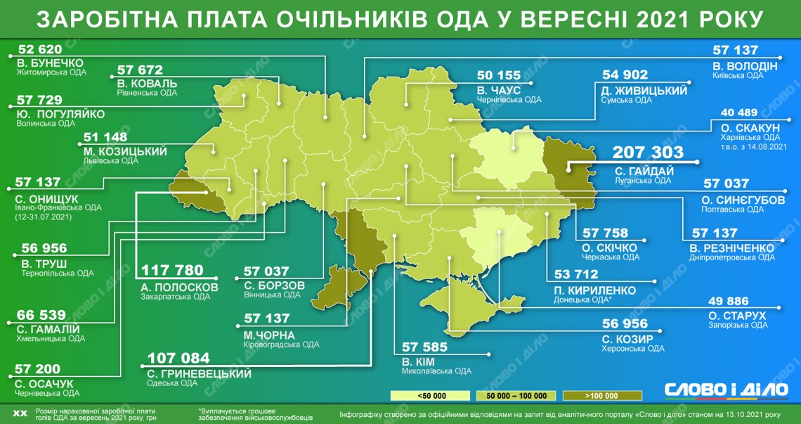 Водночас найвищу зарплату у вересні вже не перший місяць отримує голова Луганської облдержадміністрації Сергій Гайдай – 207 303 гривні. Заразом керівник Одеської області Сергій Гриневецький у вересні заробив 107 084 гривні. Інші очільники отримали менш як 70 тисяч гривень.