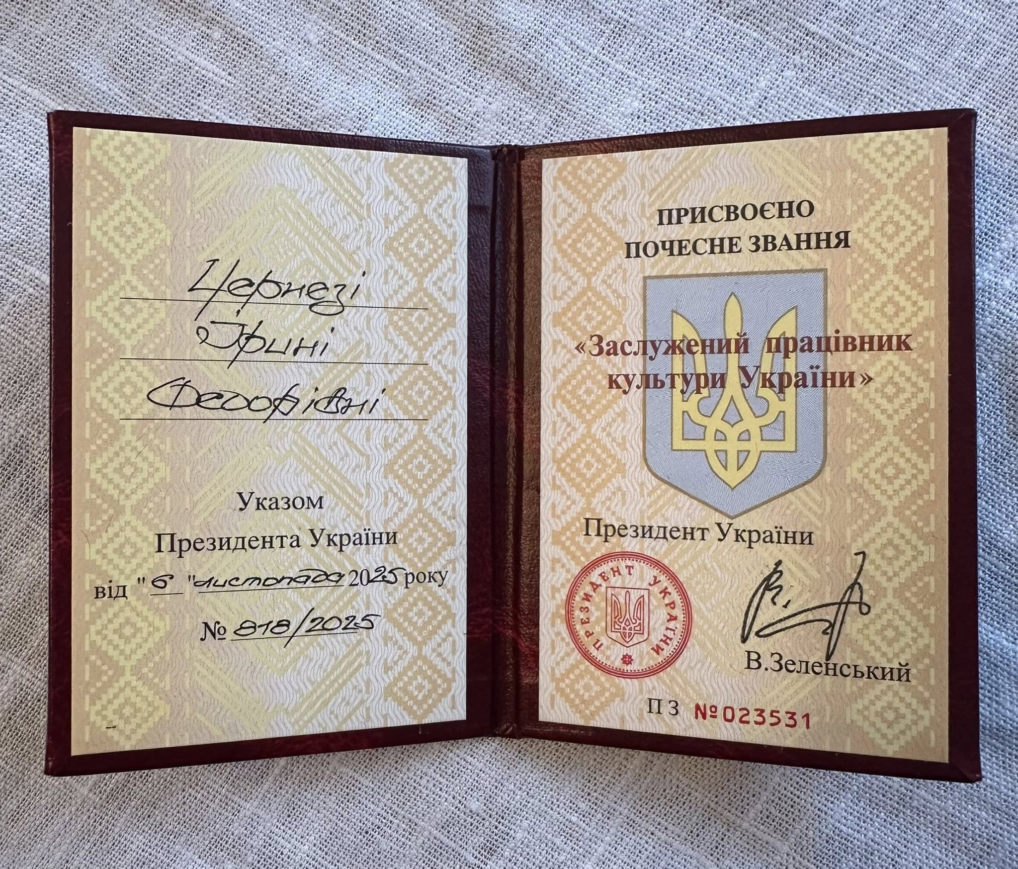 Володимир Зеленський відзначив Ірину Чернегу з Івано-Франківщини з нагоди Всеукраїнського дня працівників культури та майстрів народного мистецтва.