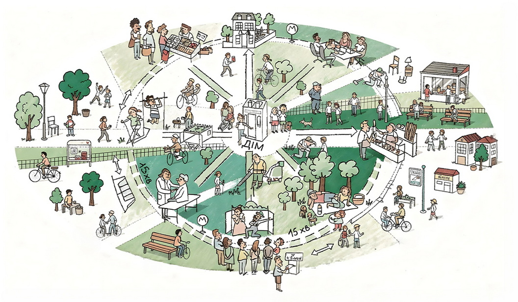 У світовій урбаністиці цей підхід часто називають концепцією «15-хвилинного міста». Її головна ідея — розмістити ключові сервіси поруч з домом, щоб людина могла витрачати менше часу на дорогу та рідше користуватися автомобілем.