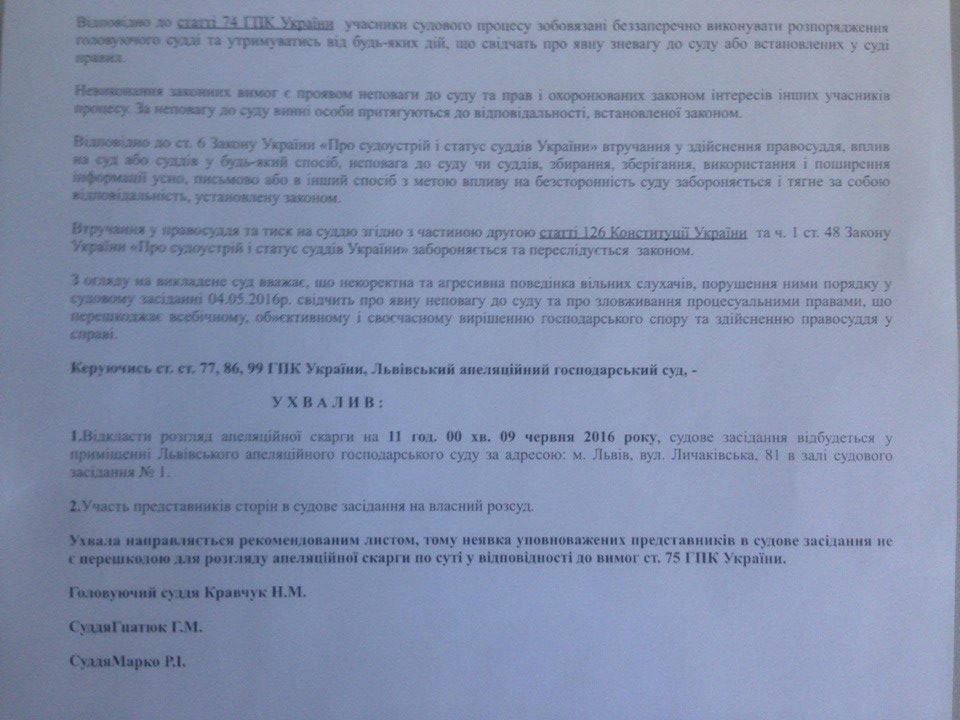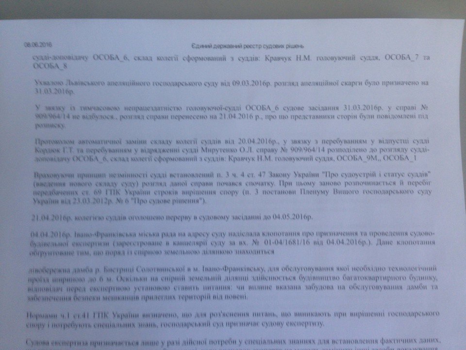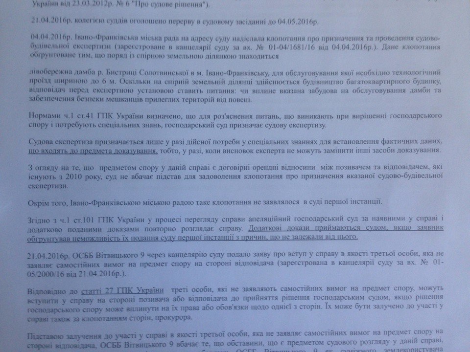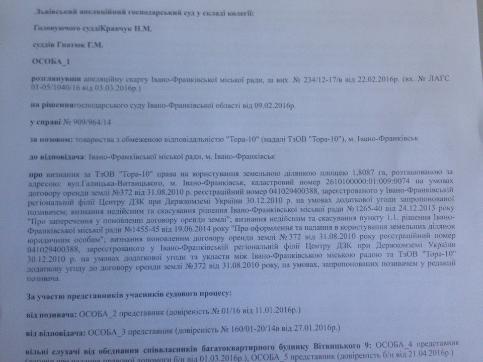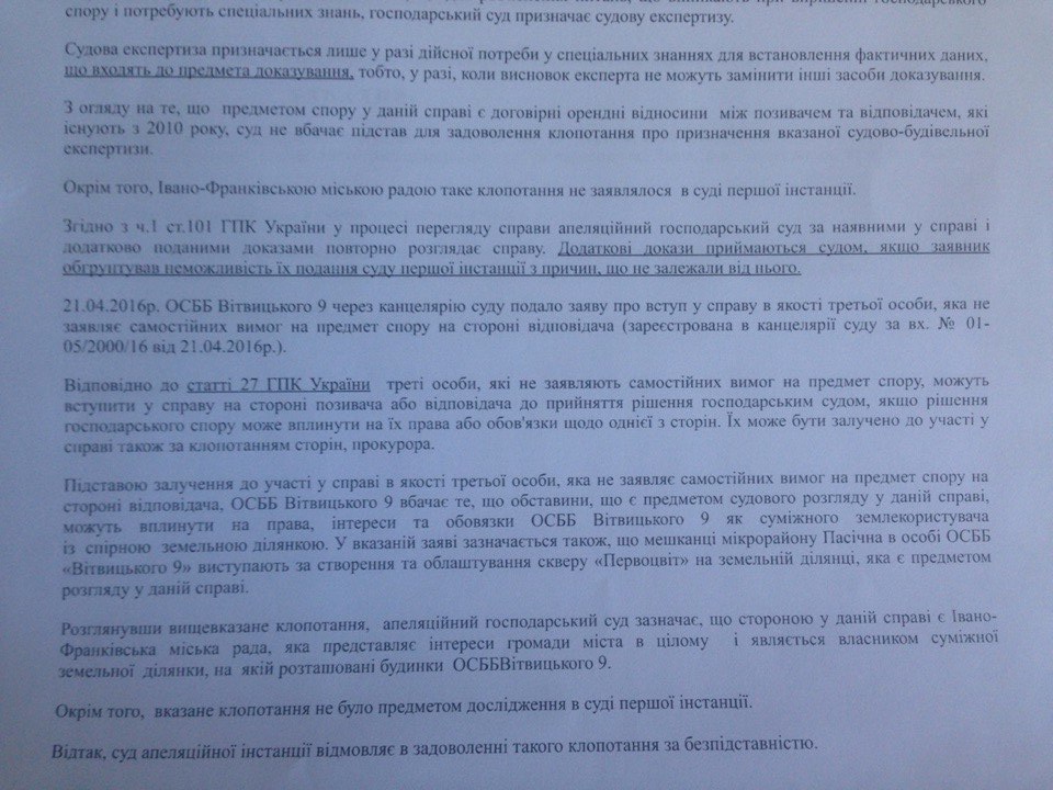 Між іншим, суд відмовив у клопотанні ОСББ «Витвицького, 9» (яке і мало б представляти громадських активістів) бути долученим до справи як 3-тя сторона. Відмова була аргументована тим, що стороною по даному процесу є міська рада, яка і представляє інтереси громади вцілому.