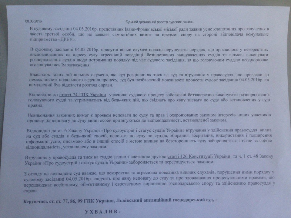Минуле судове засідання апеляційної інстанції відбулось на початку травня і не обійшлося без конфліктів. Так, через неадекватну поведінку вільних слухачів – громадських активістів суддя був змушений перенести справу, пише Фіртка з посиланням на Побудовано ІФ.