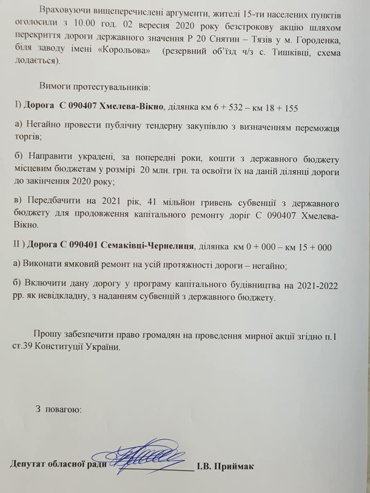 Люди вимагатимуть негайного тендеру на ремонт дороги “Хмелева – Вікно” та виконати ямковий ремонт на дорозі “Семаківці-Чернелиця” та включити її в програму капітального будівництва на 2021-2022 роки.