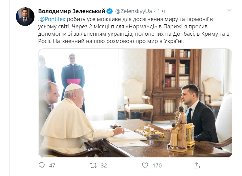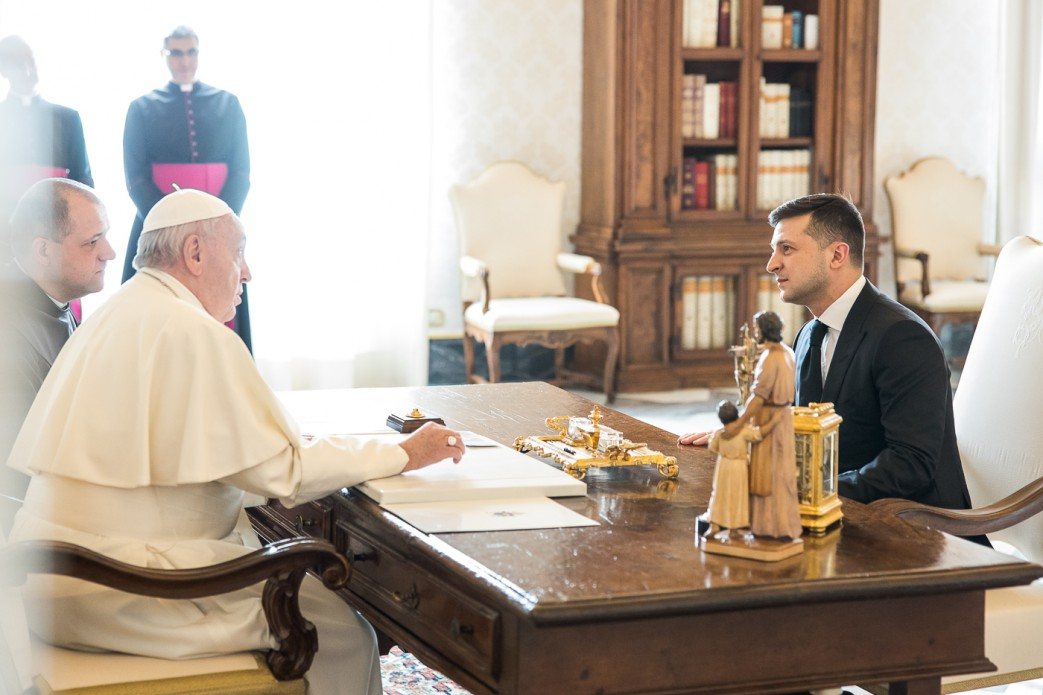 Президент України Володимир Зеленський під час аудієнції у Папи Римського Франциска попросив допомогти зі звільненням українців, полонених на Донбасі, в Криму та в Росії.