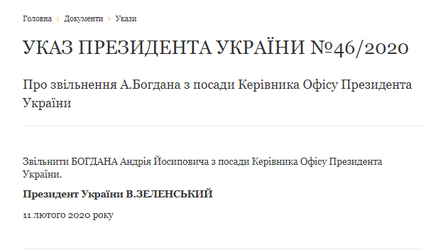 Натомість, Зеленський призначив на місце Богдана Андрія Єрмака, який із 21 травня 2019 року є помічником Володимира Зеленського. Відповідний указ також з'явиться сьогодні.