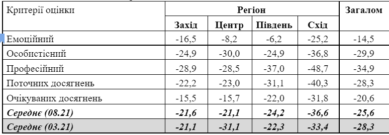 Також, 42,2% опитаних оцінюють наявні результати діяльності В. Зеленського на посаді Президента України переважно негативно, 13,9% − переважно позитивно, а 39,8% зазначають, що є як негативні, так і позитивні результати. Отже, індекс поточних досягнень фактично не змінився: –28,4 у березні проти –28,3 у липні-серпні.