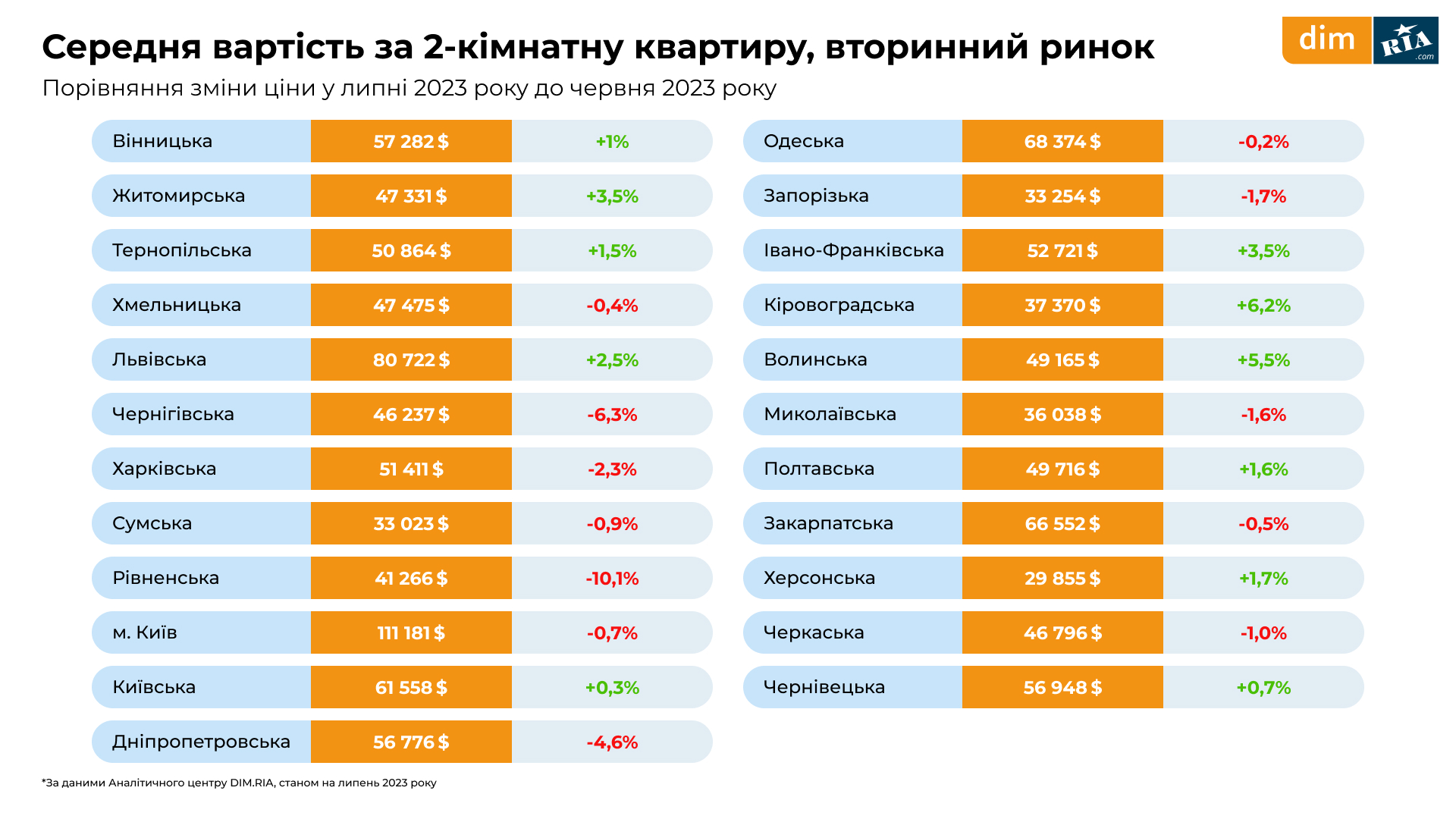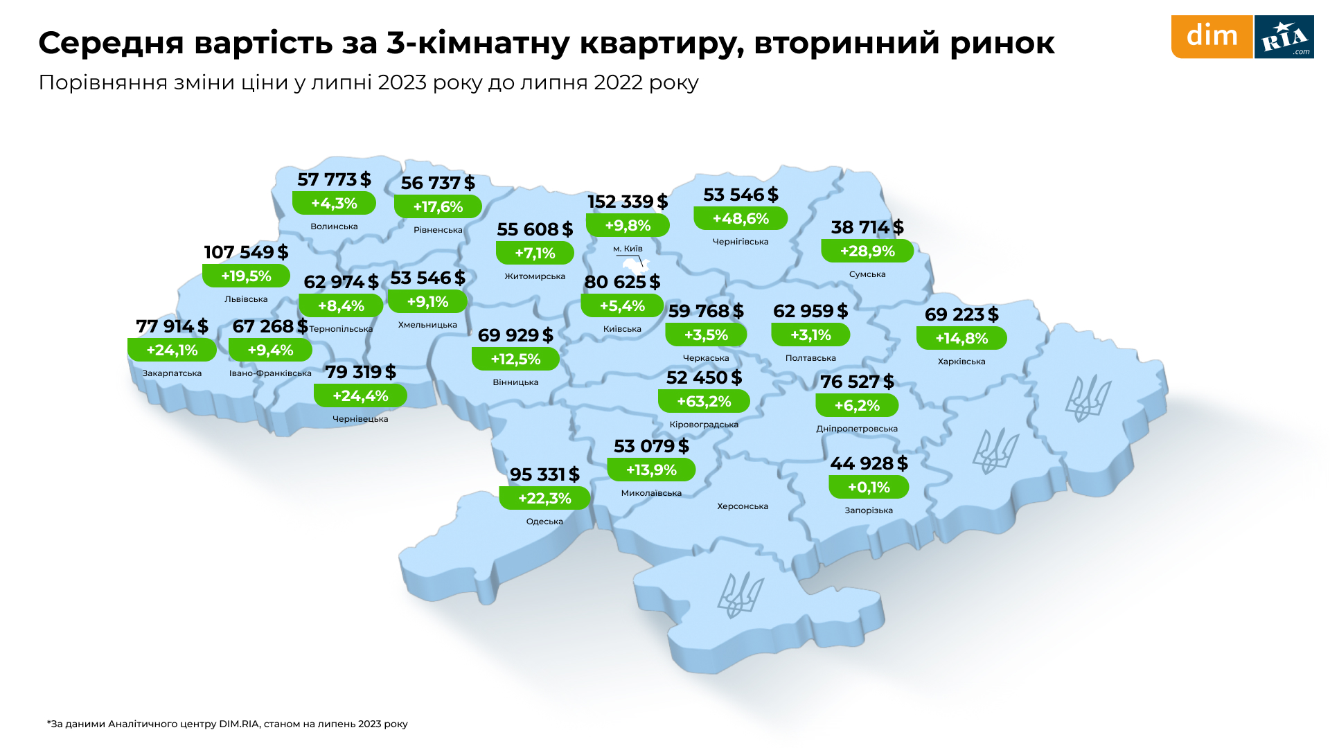 Найбільша середня вартість однокімнатної квартири складає 86 360 доларів США у Києві, потім Львівська область, де ціна 61 264 доларів США та Закарпатська область із вартістю в 49 665 доларів США.