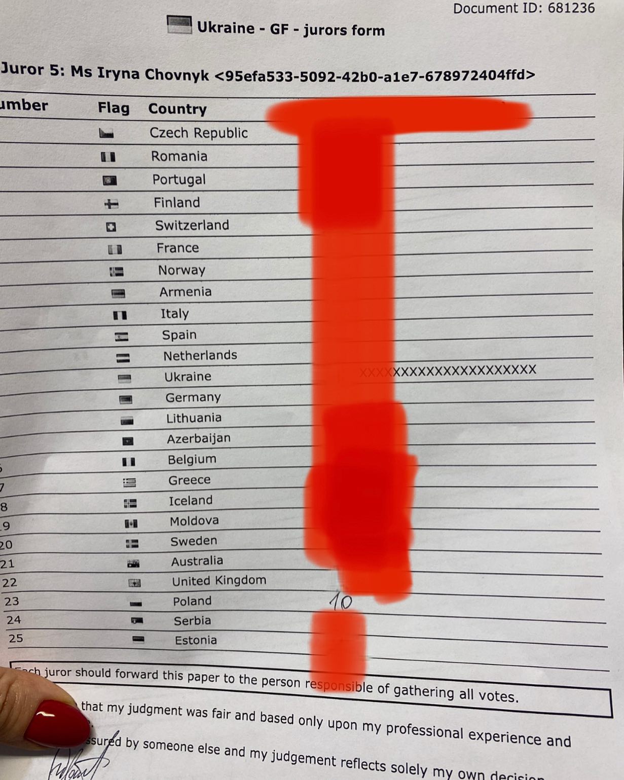 «Тому попри те, що не можна оприлюднювати свої голоси і за це можна бути оштрафованою, я скидаю фото своєї анкети, де видно, скільки балів отримала Польща особисто від мене. Як так вийшло, що для Польщі вийшло 0 балів? Я не знаю відповіді на це запитання.