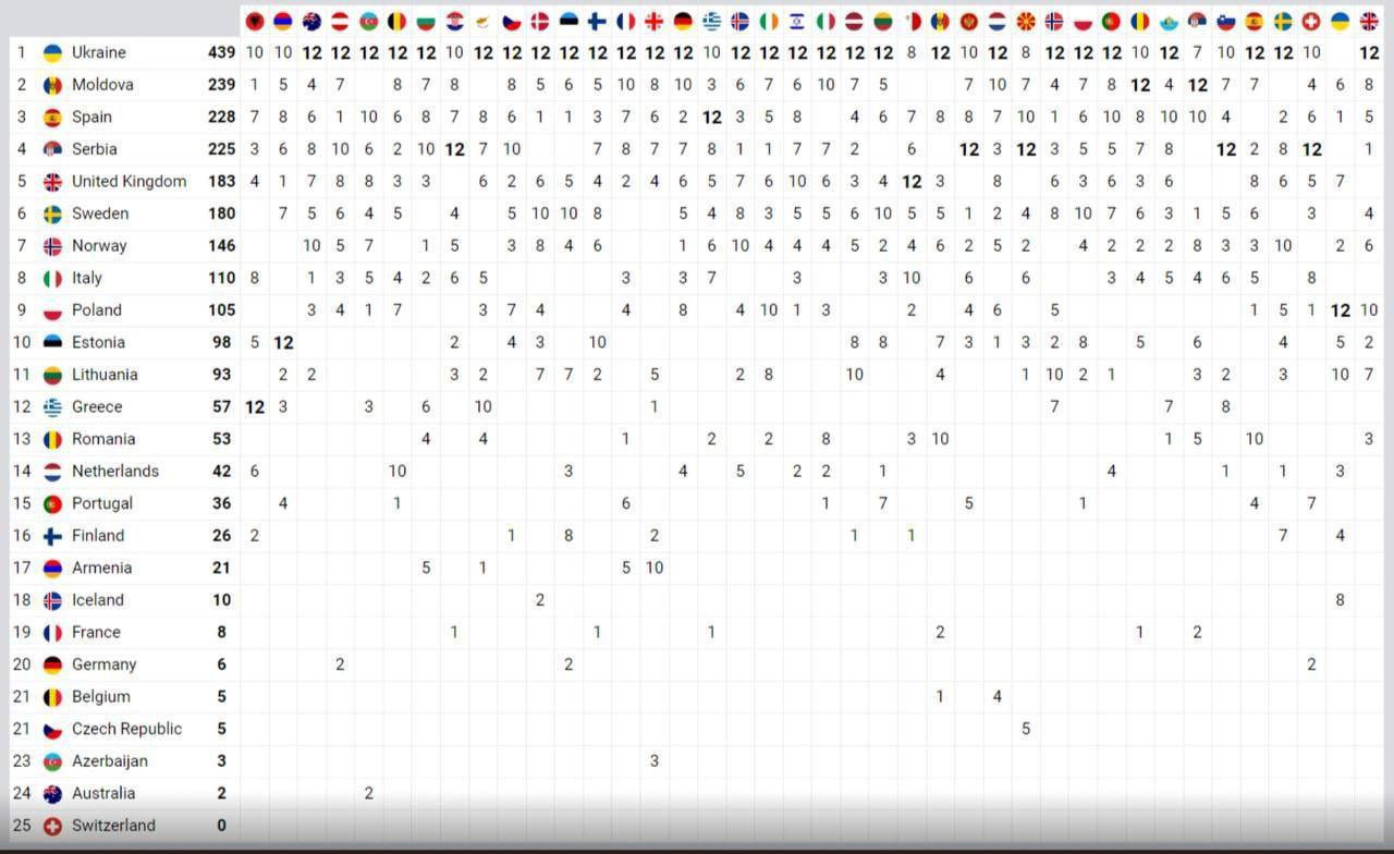Натомість українське журі віддало 12 балів представникові Великої Британії. При цьому Польщі, як і Литві, наше журі не дало жодного балу.
