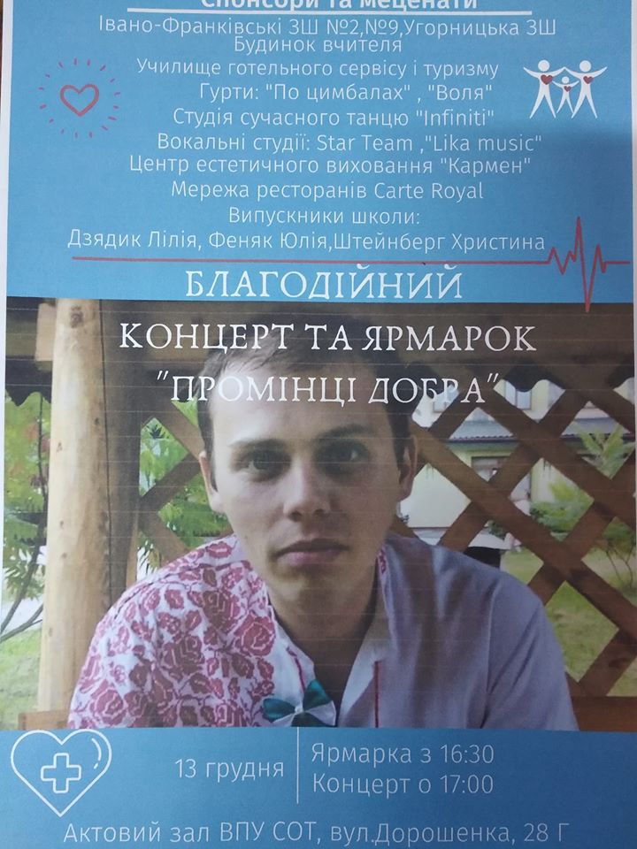 “Шановні друзі, батьки, колеги, знайомі та всі небайдужі. Запрошуємо Вас відвідати благодійний концерт та ярмарок на підтримку Михайла Савчука, який потребує термінової операції”, – запрошують організатори.