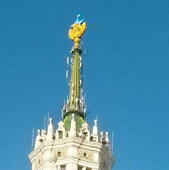 «За попередньою інформацією, невідомі проникли за внутрішніми сходами будівлі до останнього поверху, а потім за допомогою спеціального спорядження закріпили полотнище на шпилі висотки», - сказав співрозмовник агентства.