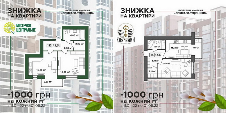 Придбайте квартиру у житловому комплексі "Містечко Центральне" та Житловий район "Княгинин" зі знижкою до 100 000 грн, при 100% оплаті вартості квартири.