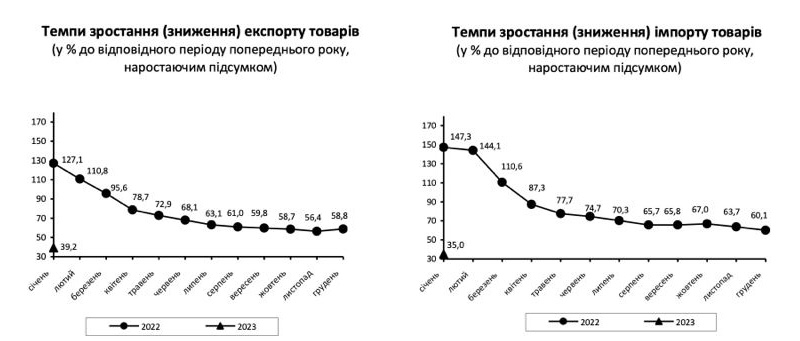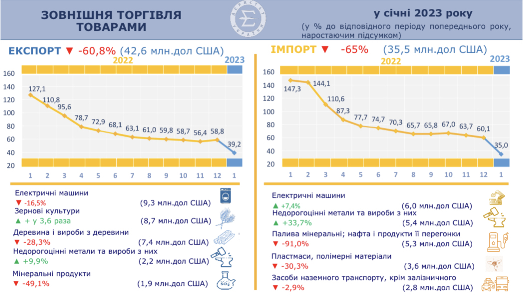 Разом з тим, у порівнянні з січнем 2022 року обсяги експорту зменшились на 60,8%, імпорту — на 65%.