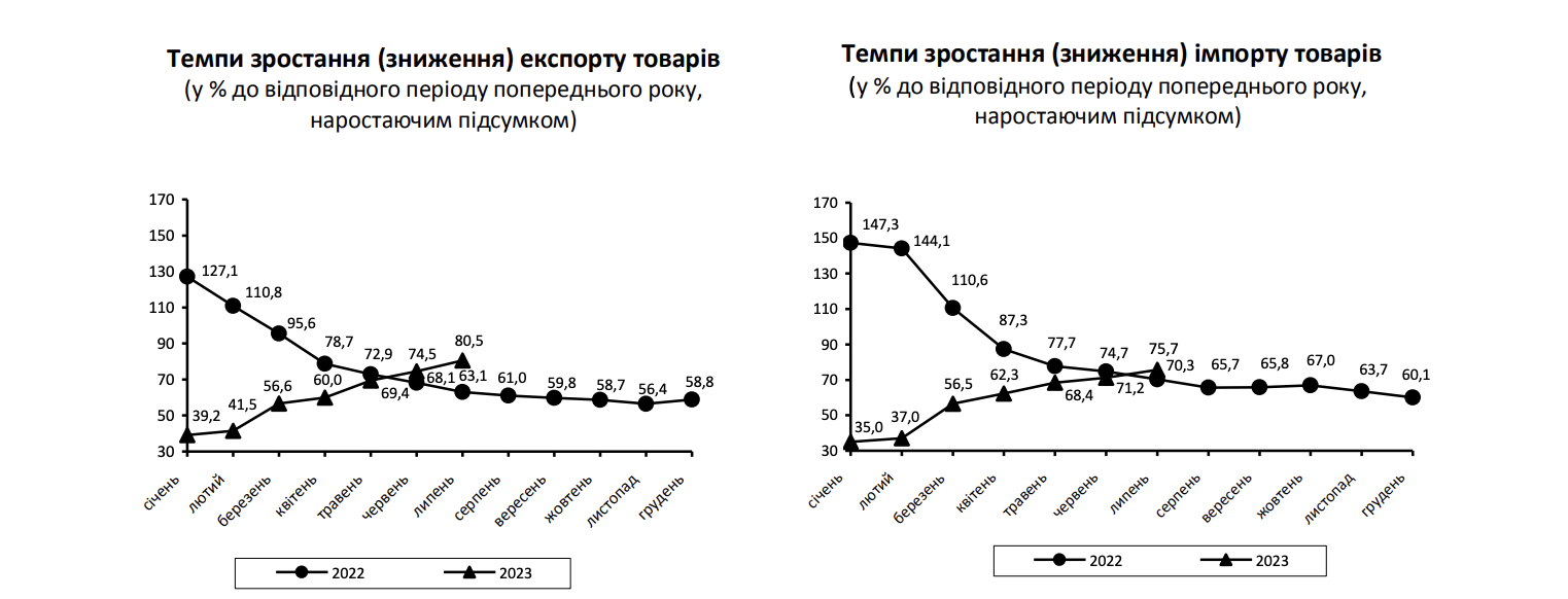 У порівнянні з січнем—липнем 2022 року обсяги експорту зменшились на 19,5%, імпорту — на 24,3%.