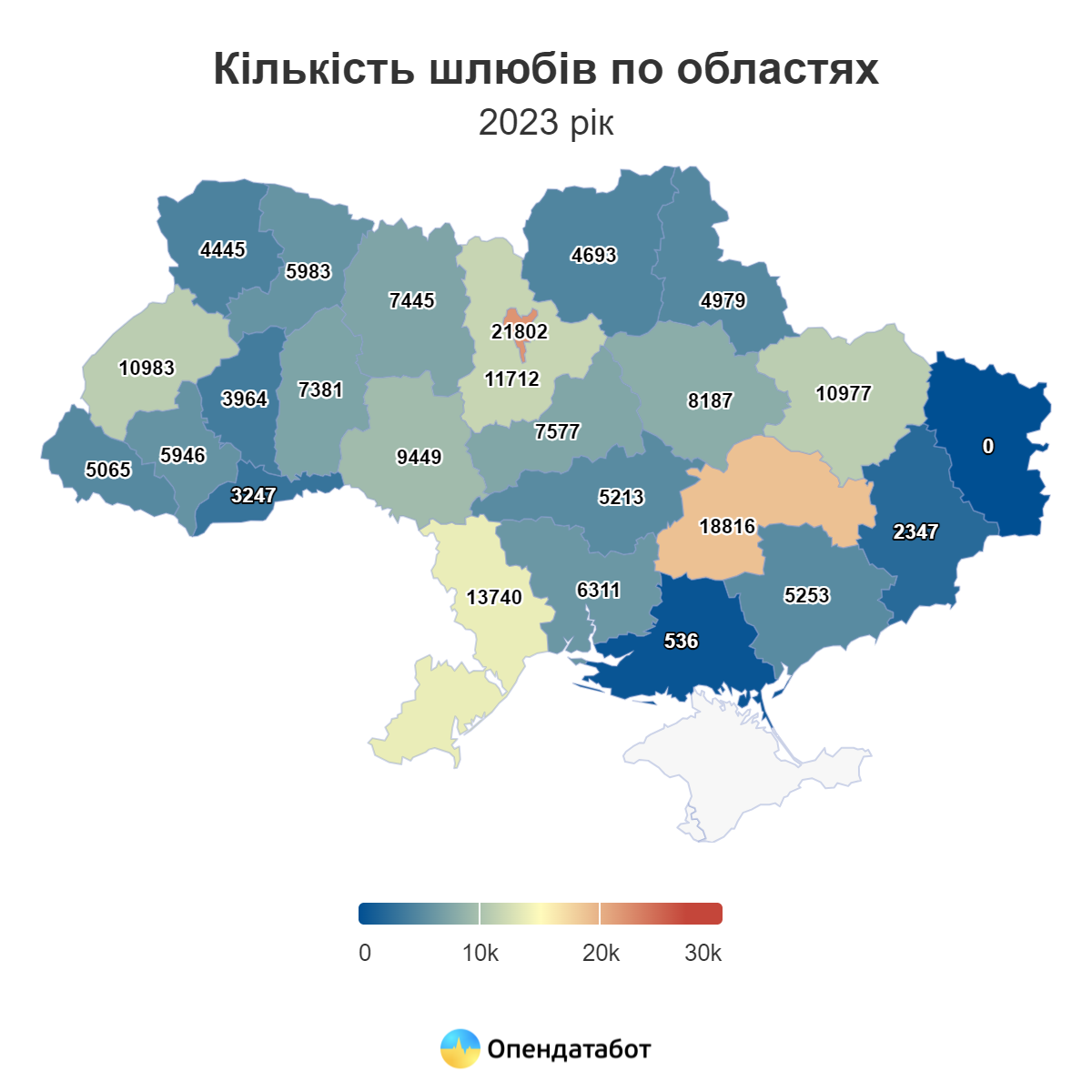 Лідером за кількістю одружень у 2023 році став Київ — 21 802, що на 14% менше, ніж у 2021 році. На другому місці Дніпропетровщина — 18 816 шлюбів. Замикає трійку лідерів Одещина — 13 740 нових сімей.