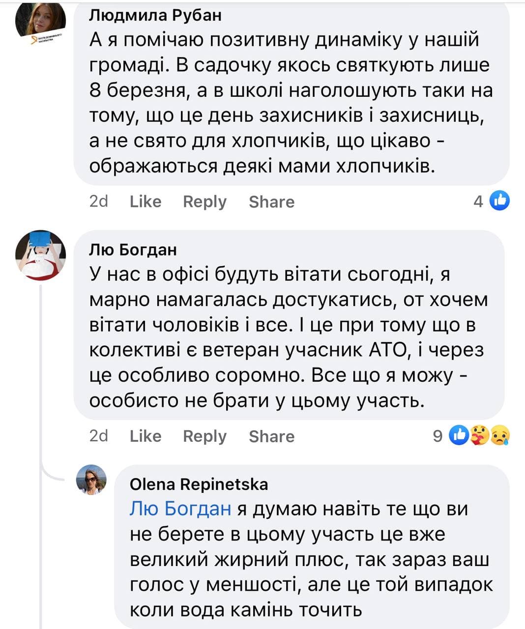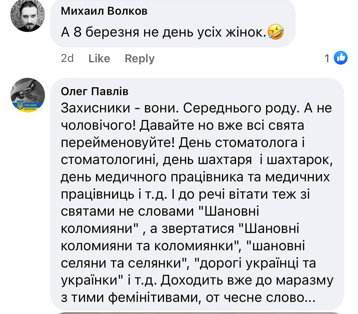 Не менше коментували й новину про те, що «День захисників і захисниць України» – це про оборону, а не гендер. Досі чимало людей сприймає це свято як «день чоловіків».
