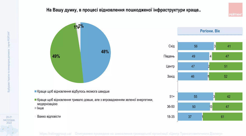 Разом з тим 49% – за те, щоб відновлення тривало довше натомість з впровадженням зеленої енергетики, модернізацією. Серед вихідців зі східних областей дещо більше тих, хто хоче швидкого відновлення, однак і серед них близько 40%, котрі не проти зачекати задля модернізації інфраструктури.