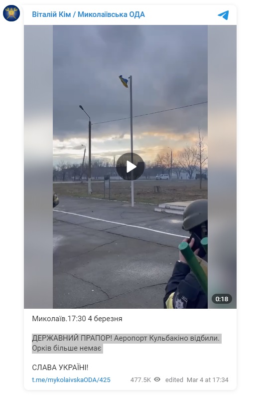 За даними пресслужби ЗСУ на околицях Миколаєва тривають зіткнення нашої армії із російськими окупантами. Наші хлопці остаточно вибили ворожі підрозділи з аеродрому Кульбакіно. Над аеропортом піднято державний прапор України.