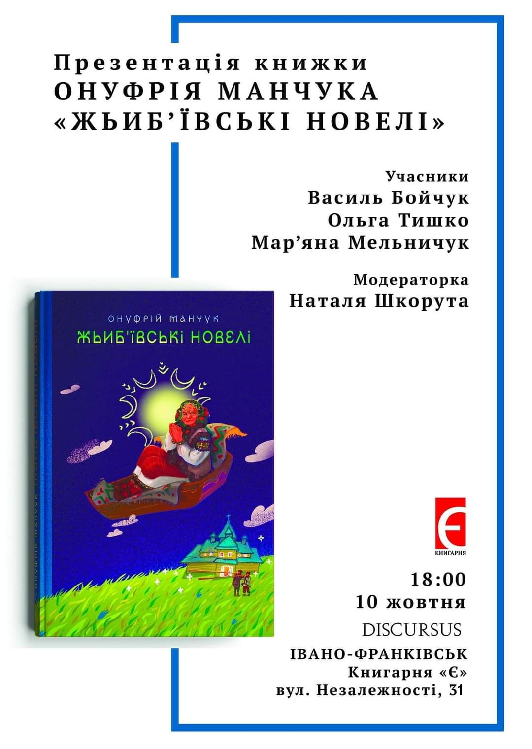 Всіх, хто любить наші гори та легенди гуцулів, запрошуємо 10 жовтня у Книгарню "Є" (вул. Незалежності, 31) на презентацію нового видання «Жьиб’ївських новель» Онуфрія Манчука.
