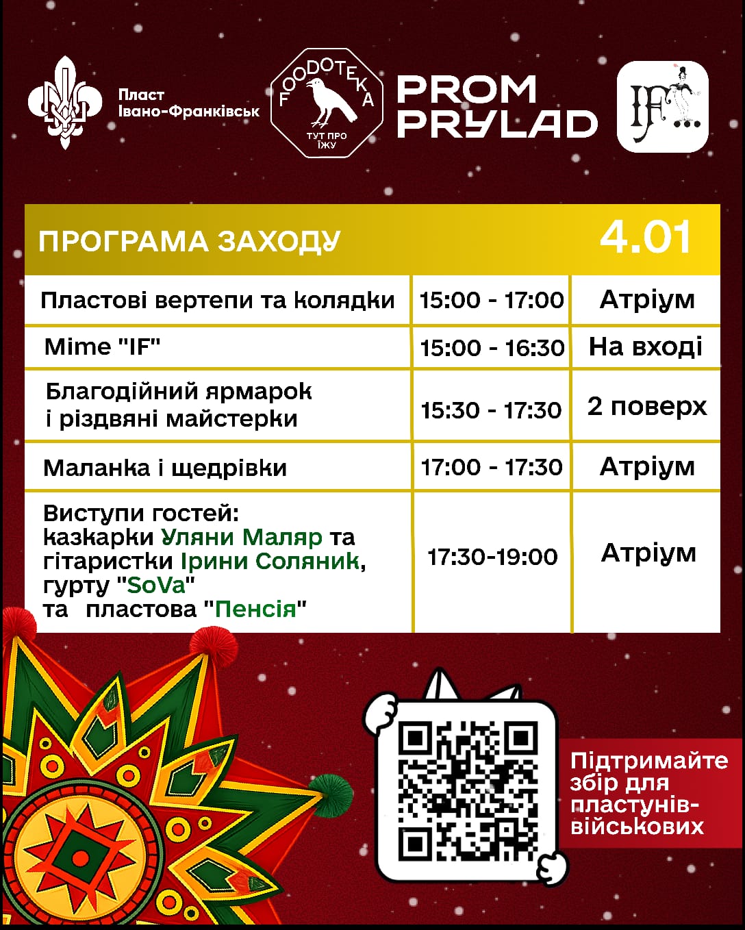 У неділю, 4 січня 2026 року з 15:00 до 19:00 год на локації «Промприлад» відбудеться щорічна благодійна акція «Різдвяна свічечка», яку організовують пластуни з метою збору коштів для підтримки наших захисників і захисниць.