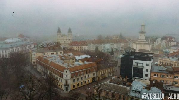 "Івано-Франківськ в тумані готується до свят, а голуби охороняють місто зверху", - підписав світлини фотограф.