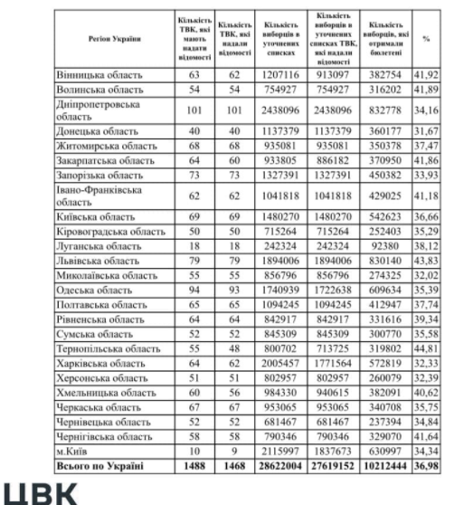 Також ЦВК оприлюднила оперативну зведену інформацію про кількість виборців, які отримали виборчі бюлетені на виборчих дільницях на момент закінчення голосування у розрізі регіонів України, станом на 22 годину.