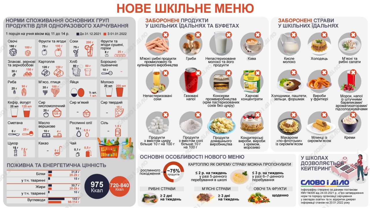 Крім того, у шкільних їдальнях заборонили використовувати м’ясні та рибні продукти промислового та кулінарного виробництва, гриби, непастеризоване молоко та його вироби, каву, непастеризовані соки, газовані напої, консерви промвиробництва, харчові концентрати, продукти з вмістом цукру та солі більше як 10 г/100г, продукти домашнього виробництва, кондитерські вироби та вироби з кремом і морозивом.