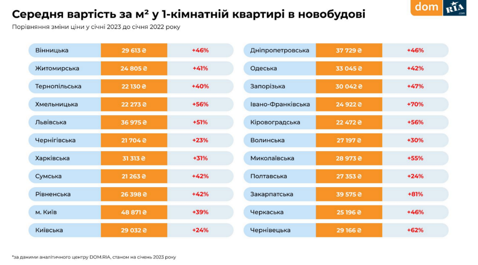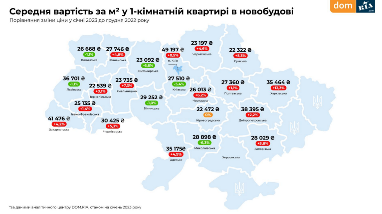 В Івано-Франківській області середня вартість м² в 1-кімнатній квартирі в новобудові складає 25 135 гривень, що на 1,4% більше ніж у грудні.