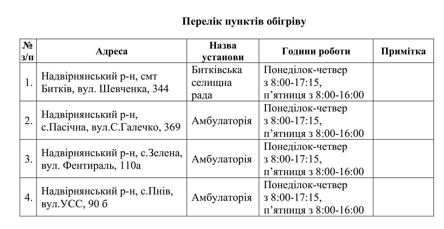 Відповідно до розпорядчого документа, стаціонарні пункти обігріву діють в приміщенні Битківського старостинського округу (приміщення колишньої Битківської селищної ради), Зеленської, Пасічнянської, Пнівської амбулаторій загальної практики - сімейної медицини.
