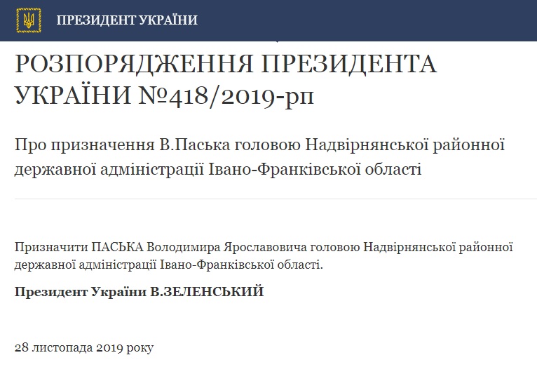 Сьогодні, 28 листопада, Президент України Володимир Зеленський підписав розпорядження про призначення нового голови Надвірнянської районної державної адміністрації.
