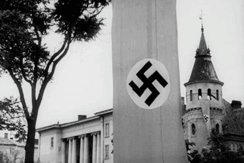 Отож, унікальне відео. 14 серпня, 1941 року. Угорська влада, яка пробула у місті близько двох місяців передає свої обов’язки німцям. На подію приїздить губернатор дистрикту «Галичина» Карл фон Ляш. Будівлі оформлені свастиками. В кадри потрапляє стометрівка, вулиця Вітовського, Курбаса, сквер Міцкевича та фасад театру.