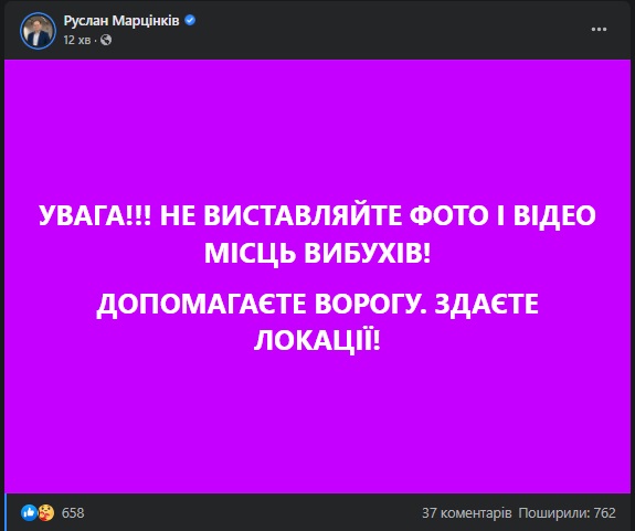 Фіртка нагадує, якщо раптом ви стали випадковими очевидцями артобстрілу чи авіаудару, переконливо просимо вас — не поширювати одразу інформацію в соціальних мережах!
