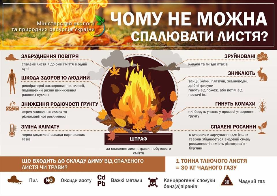 В ДСНС України радять опале листя, суху траву і бур’яни не палити, а компостувати. Коли листя перегниває, то стає добривом і до ґрунту повертаються всі необхідні для родючості речовини.