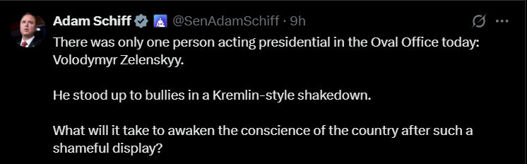 Адам Шифф також назвав переговори у Білому домі "ганебним видовищем" та вказав, що тільки Володимир Зеленський поводив себе по-президентськи.