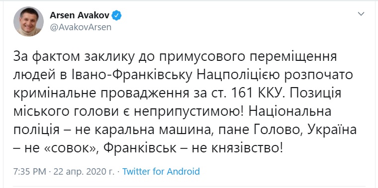 "За фактом заклику до примусового переміщення людей в Івано-Франківську Нацполіцією розпочато кримінальне провадження за ст. 161 ККУ. Позиція міського голови є неприпустимою! Національна поліція – не каральна машина, пане Голово, Україна – не «совок», Франківськ – не князівство!", - написав міністр у своєму Твітері.