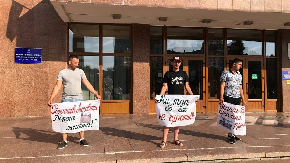 Акцію протесту організували жителі Спаської громади, що на Рожнятівщині, під будівлею облдержадміністрації. Приблизно пів сотні людей із плакатами вимагають ремонту дороги місцевого значення "Рожнятів-Липовиця".