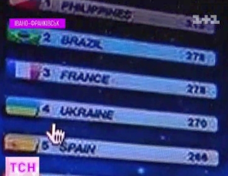 Ганна показала світлину, яку в Інтернет виклала одна з учасниць змагань. Це таблиця з рейтином конкурсанток після проміжних етапів: "пляжна мода", "топ-модель", "таланти", "спорт", "доброчинність". Україна набрала 270 балів та посіла четверте місце.