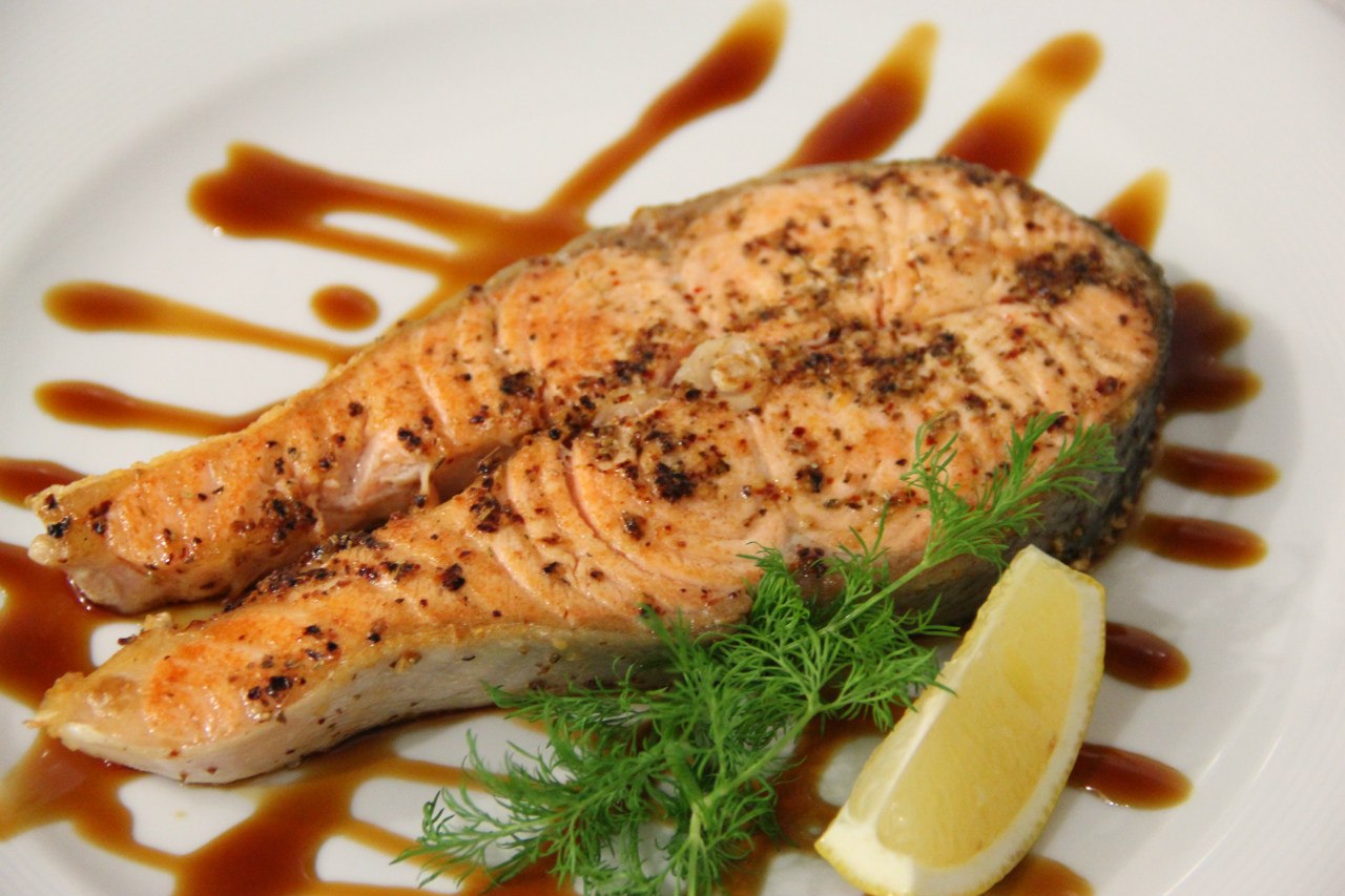 Також ресторан «Біле і чорне» пропонує гарячі рибні страви: дорадо зі шпинатом (70 грн.) і стейк лосося, смажений на грилі (вагова страва, 35 грн. / 100 г). На десерт запропонують яблуко, запечене з медом та горіхами.