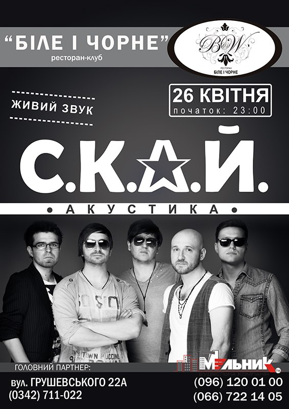 Саме цієї суботи у ресторані-клубі «Біле і чорне» пройде чергова зіркова вечірка. Зіркового статусу вечірці нададуть фаворити української рок-музики – гурт «С.К.А.Й.».