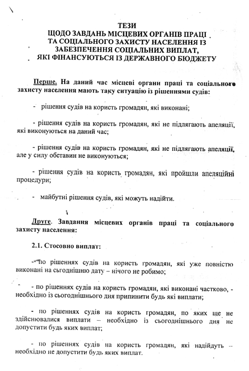 В одну іх соціальних мереж потрапив документ «Тези щодо завдань місцевих органів праці та соціального захисту населення із ЗАБЕЗПЕЧЕННЯ СОЦІАЛЬНИХ ВИПЛАТ, які фінансуються із державного бюджету». А точніше (з документу): «…необхідно не допустити будь яких виплат».