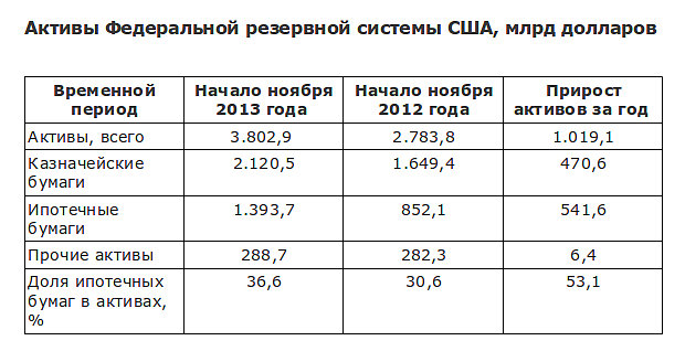 Я бы не стал возвращаться к событиям февраля-марта 2013 года, если бы не те цифры, которые я увидел на сайте Федерального резерва на днях. За 8 месяцев валюта баланса ФРС выросла еще на 800 миллиардов долларов, достигнув на начало ноября 2013 года величины 3,8 триллиона долларов. Данные об изменении активов ФРС за последний год приведены ниже.