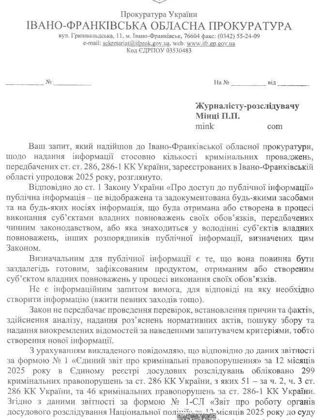 Фіртка отримала офіційні дані від Івано-Франківської обласної прокуратури про кримінальні провадження ти вироки за 2025 рік, які стосуються ДТП.