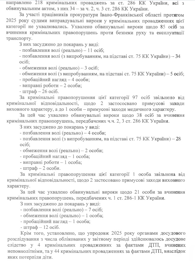 - Кримінальних проваджень за ст. 286 КК України – 218 (всі з обвинувальним актом, з них з тяжкими наслідками – 34)