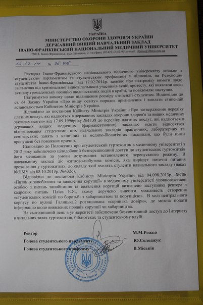 Також було прийнято резолюцію до ректорів вишів, міської ради, Міносвіти, МОЗ, МВС та Генпрокуратури.