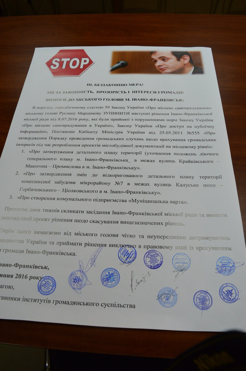 Варто зауважити, за повідомленням видання Курс, громадські активісти скерували скаргу з проханням перевірити законність прийнятих міською радою рішень в прокуратуру Івано-Франківської області та генпрокурору Юрію Луценку.