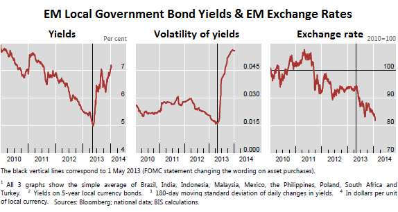 А вот как, согласно рабочим документам Банка международных расчётов, доходность правительственных облигаций стран, волатильность этой доходности и валюты щекотали нервы со времени начала какофонии сокращения КС с начала прошлого мая (чёрная вертикальная линия). Вид неприглядный:
