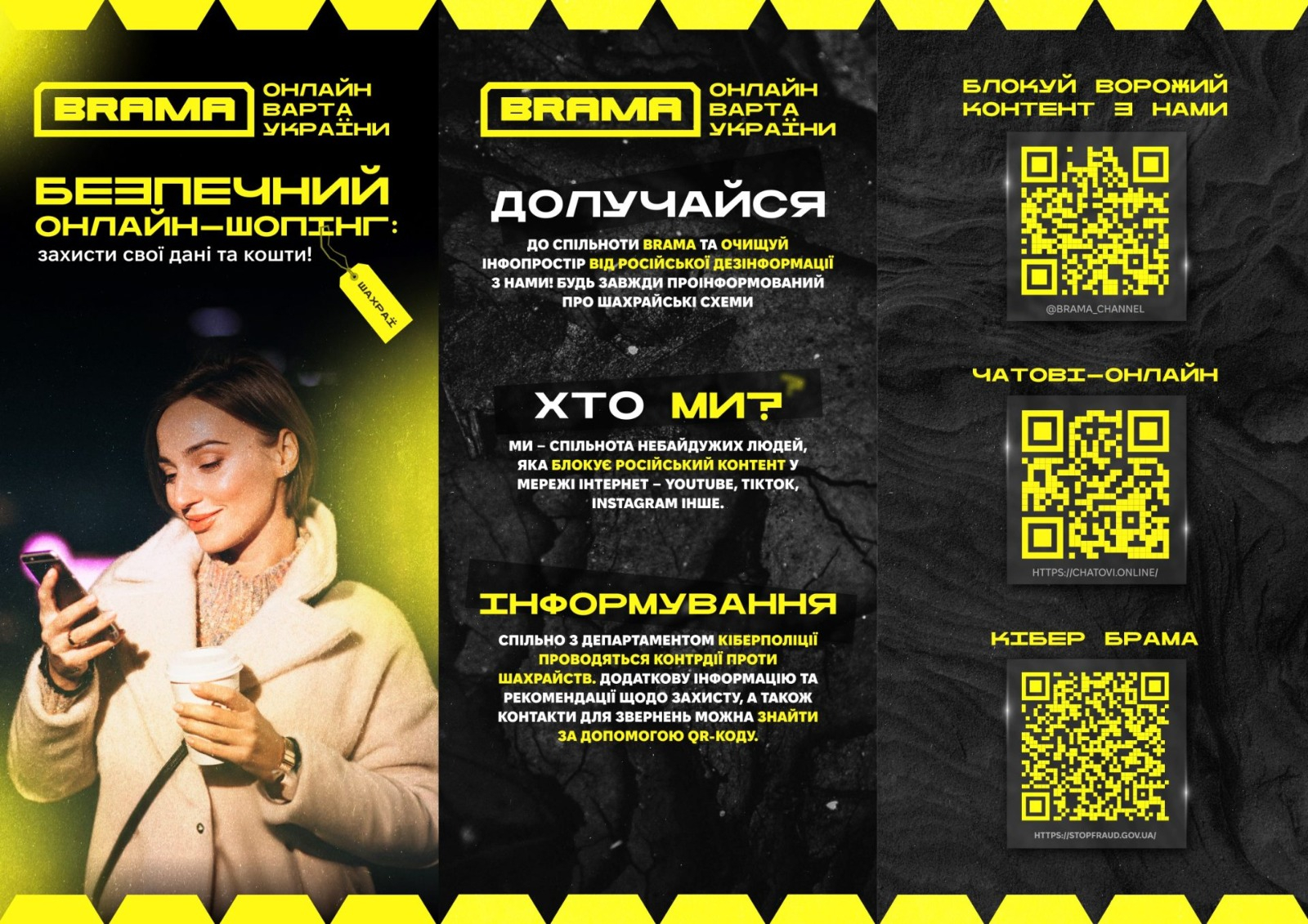 «BRAMA» — це онлайн-ресурс, розроблений за підтримки Кіберполіції, який допомагає громадянам ідентифікувати кіберзагрози, навчитися основам цифрової безпеки та повідомляти про інциденти шахрайства в мережі.