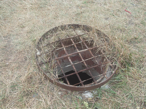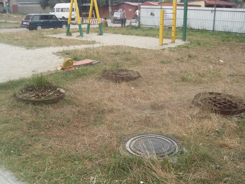 На вулиці Угорницькій за метр від майданчика знаходяться каналізаційні колектори, які, замість люків, прикриті металевими решітками.