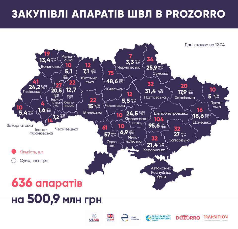 Найбільше апаратів ШВЛ закупили в Дніпропетровській (104), Київській (75), Одеській (61) і Львівській (41) областях.