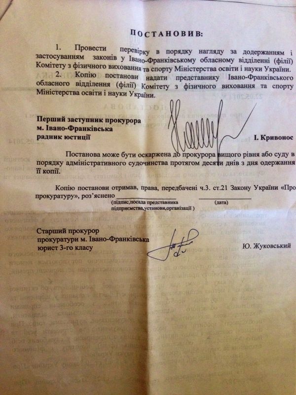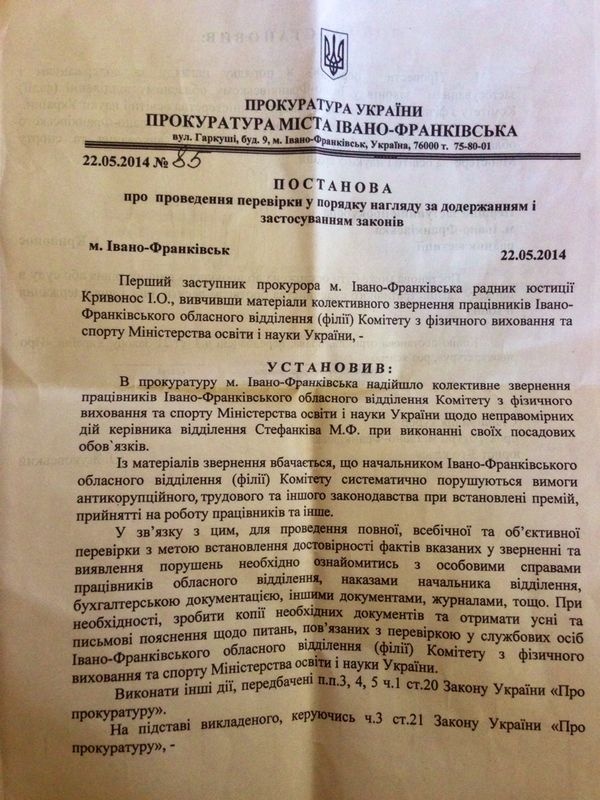 Прокуратура Івано-Франківська розпочала проведення прокурорської перевірки відносно начальника обласного відділення Комітету з фізичного виховання та спорту Міністерства освіти і науки України Михайла Стефанківа.